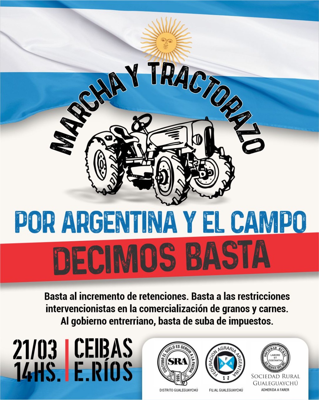 Hoy lunes 21 de de marzo se realizará en Ceibas un tractorazo y marcha, convoca la Sociedad Rural de Gualeguaychú,adherida a la Federación de Asociaciones Rurales de Entre Ríos (Farer), la Filial Gualeguaychú de la Federación Agraria Argentina (FAA) y la Sociedad Rural Argentina (SRA).